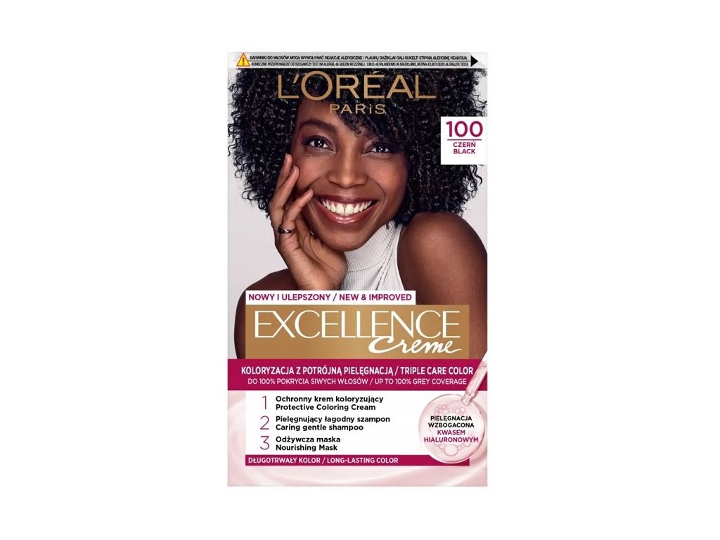 Rada farieb na vlasy Excellence od L'Oréal Paris vám prináša účinný a starostlivý rituál s trojitou ochranou. Farby Excellence môžete použiť pre akýkoľvek odtieň vlasov, kedykoľvek a bez starostí. Naše jedinečné zloženie, ktoré je k dispozícii v rôznych odtieňoch, dodáva vlasom bezkonkurenčný lesk, ktorý vydrží aj po mnohých umytiach. Súčasne chráni vlasy počas i po farbení. Ak hľadáte jednoduchý spôsob, ako si farbiť vlasy, zakryť šediny a udržiavať nádherný vzhľad, nepotrebujete nič iné ako Excellence. Rituál farbenia sa skladá z troch krokov. Prvým je ochranný farbiaci krém, ktorý obsahuje Pro-Keratin a sérum s aktívnymi látkami, ktoré chránia vlasy počas farbenia a prinášajú dlhodobý výsledok s až 100% krytím šedin. Druhým krokom je jemný ošetrujúci pH šampón po farbení, ktorý jemne stará o pokožku hlavy a čistí vlasy od zvyškov farby, uhladzuje vlasy a odhaľuje ich lesk. Tretím krokom je ľahká vyživujúca maska na vlasy s obsahom ceramidov, ktorá vlasy vyživuje bez zaťaženia. Vlasy voňajú sviežo, sú plné vitality a majú krásny lesk. Balenie obsahuje: 1 Oxidačné činidlo 1 Farbiaci krém 1 Hrebienkový aplikátor 1 Jemný ošetrujúci pH šampón 1 Maska 1 Návod na použitie 1 Pár rukavíc